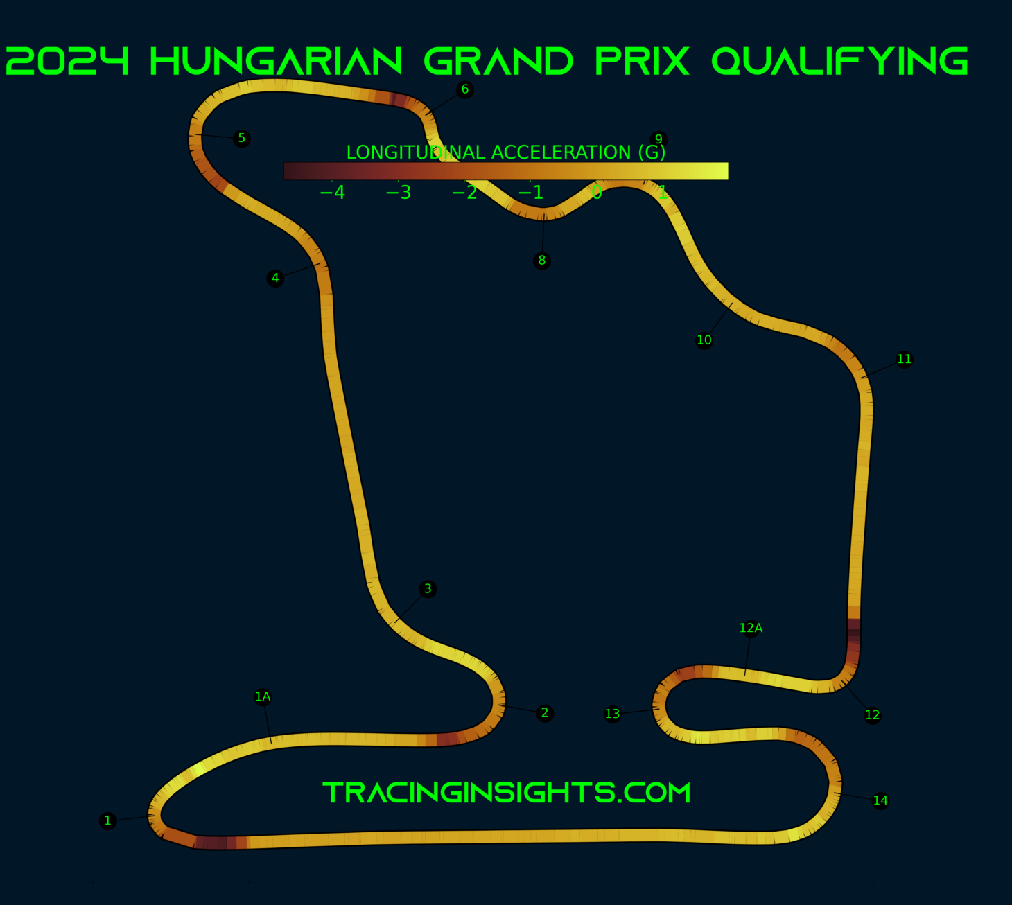 The 4.381-kilometer Hungaroring is a winding circuit, featuring 14 corners, six left and eight right. Many of these corners follow in quick succession, making a well-balanced car that can handle rapid directional changes vital for a competitive lap time. The layout includes various corner types, from those requiring heavy braking to low-speed turns. Turn 5, for example, is taken blind, with the contours creating a heightened sense of speed.
