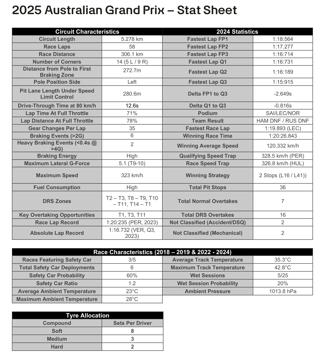 Melbourne features the shortest pit lane on the calendar at just 281 meters, with cars spending only about 17 seconds at pit lane speed. Race engineers will note the pit exit has reverted to its 2018 configuration, giving drivers more room when rejoining the track.